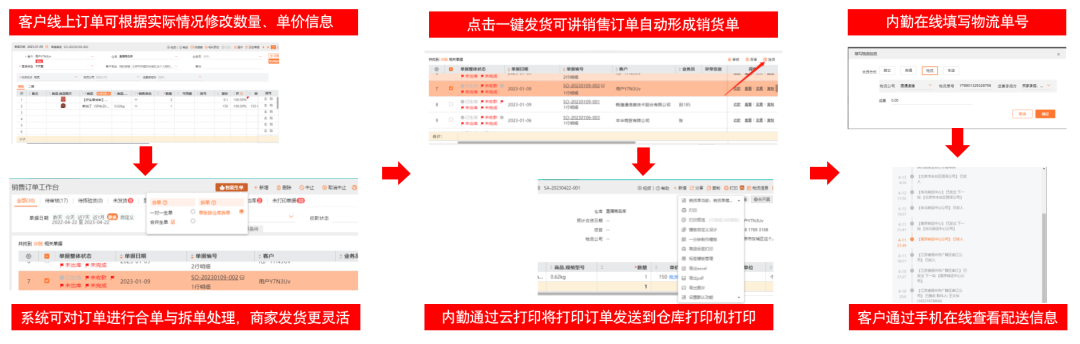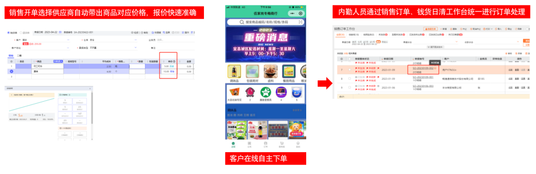 开通好业财旺铺引导户自主在线下单,在线支付、启用订单自动审核,实现发货单自动打印,仓库发货后回传物流信息客户在手机端实时查看订单配送信息。
