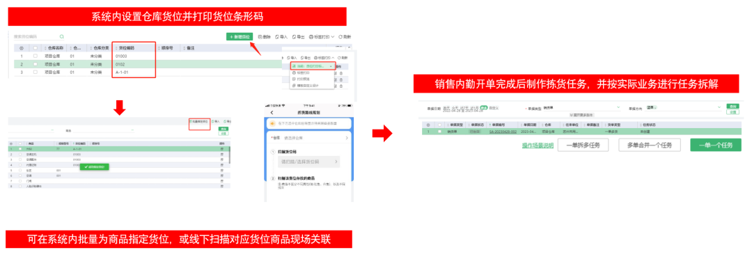 4、仓库货位、拣货管理难。公司仓库数量多、仓储面积大、商品数量多,仓管人员拣货慢,易出错,销售单商品多仓库存放,需要人工拆单,分拣、汇总,沟通成本高工作量大。