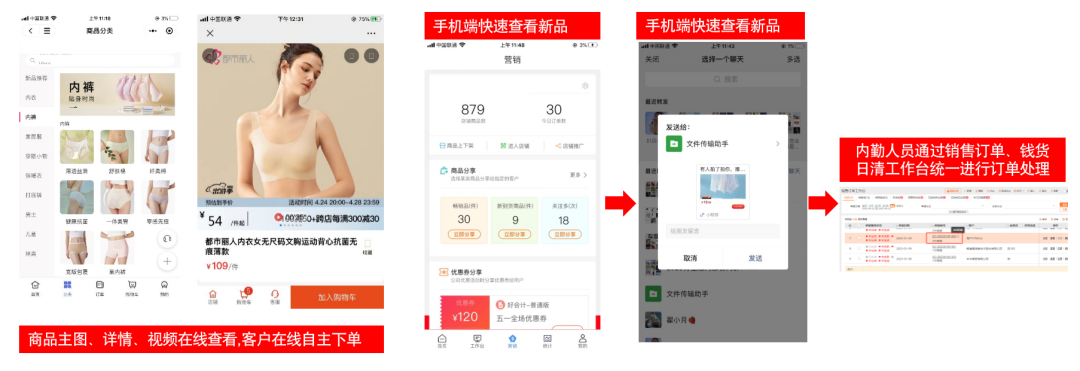 商品上新、更新快,客户下单需要看品,公司上新后业务员发新品到朋友圈或私信客户,工作量大效率低,客户下单主要通过微信、电话形式,沟通成本高,效率低。