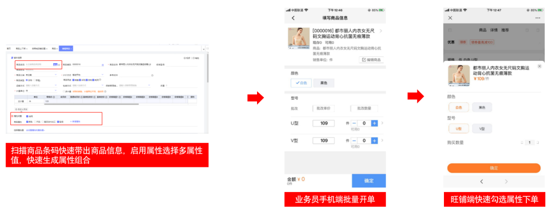 2、服装建档、多属性销售开单。服装行业商品更新快、属性多、尺码多,建档工作量大,客户下单时商品混合下单,销售录单时需要逐一选择,开单效率低;